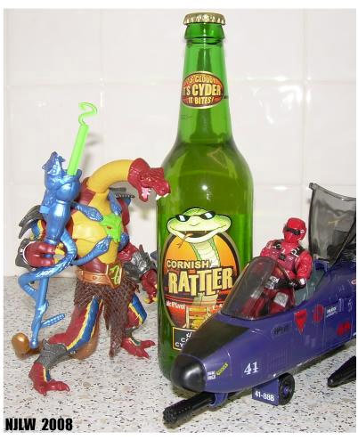 Again, this is a cider (or, if you look at the label, cyder, which is presumably more traditional / rustic / pretentious), but it's found in the beer aisle of my nearest supermarket, and I've got the toys to back it up, so I'm including it in this feature. The label on the bottle says "It's cloudy - It's cyder - It bites!" While not as sweet as Woodchuck Amber from Vermont (The King of Ciders, as far as I'm concerned), it's nowhere near as bitter and tart as most British ciders, some of which could give battery acid a run for its money. Unlike General Rattlor or the Cobra Rattler pilot Wild Weasel, Cornish Rattler is actually very nice, and its much-touted "bite" is mainly in its pleasant lingering aftertaste (tangy enough to make you salivate but not wince) and 6% ABV rating.