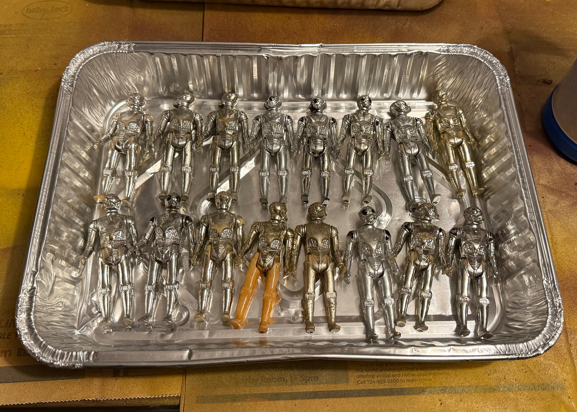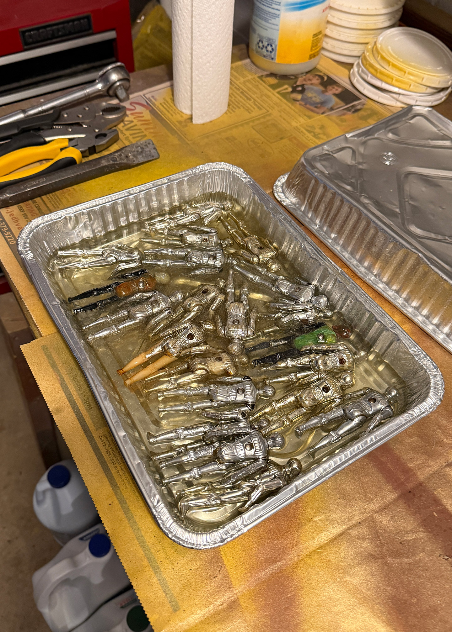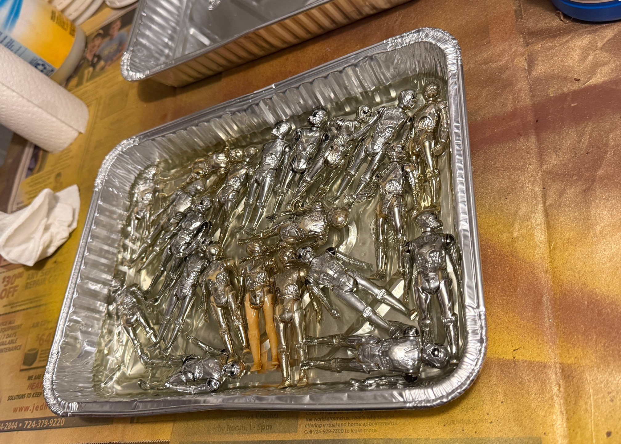 But first I gotta prep the figures for their base color. It'll be blue... I still need to shop for the spray paint. But you can't just spray chrome cuz it won't stick. That's where the brake fluid comes in...