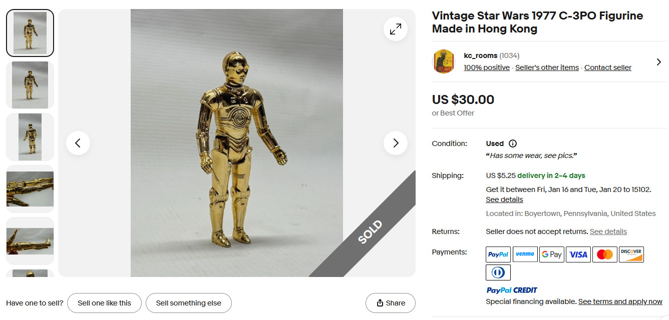 Thus began my quest to score a loose freakishly gold 3PO for my collection. It's been TWO FREAKING DECADES without success. A few weeks ago, during my daily eBay searches, I came across a promising candidate.