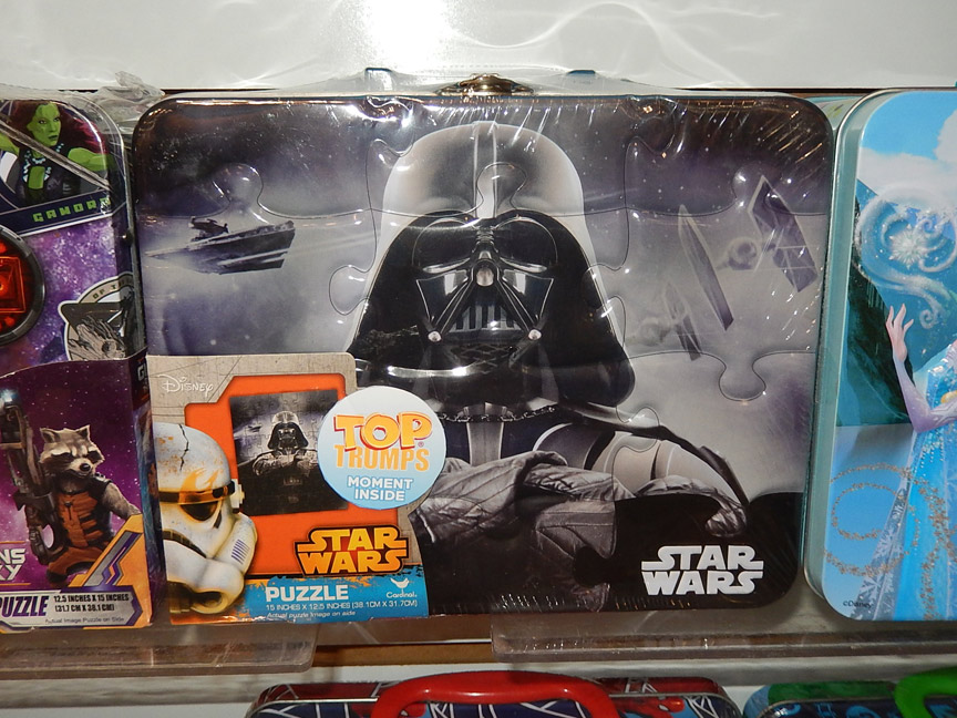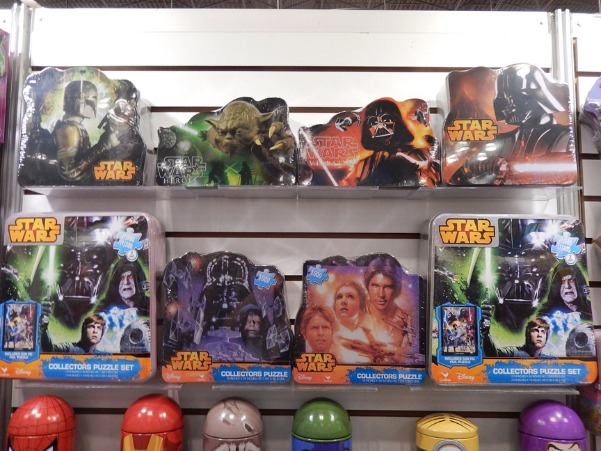 Another Puzzling vendor was Cardinal Industries. Their line includes puzzles packed in several different tins. The tins range from shaped and square tins to Vader and R2-D2 puzzle capsules. The capsules come in two different sizes, small 24 pieces and large 100 pieces. They also showed “lunch box” style tins with handles. They are currently working on EVII products and, nevermind, can’t talk about it. They also showed, but did not allow any photographs, of their crowd sourced trivia game. Apparently over 800,000 trivia questions were received from fans around the world and they narrowed that down to 500 questions. Each question card will include the name of the person who submitted that question. The game is expected to hit retain around July/August. www.cardinalgames.com