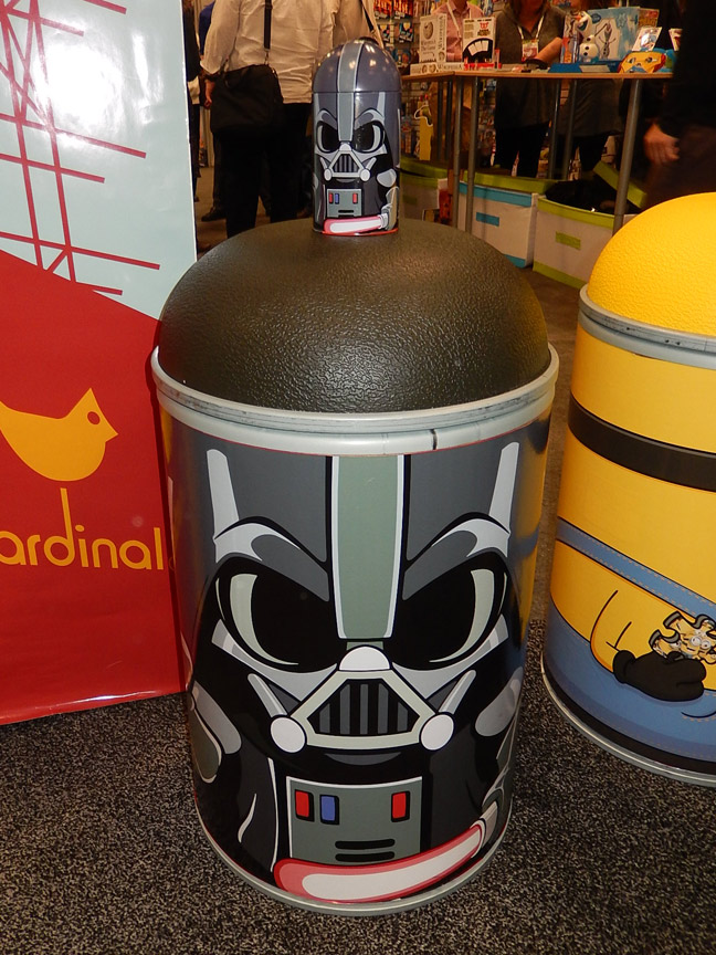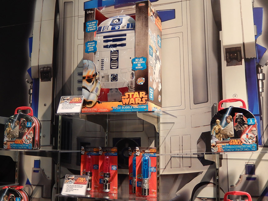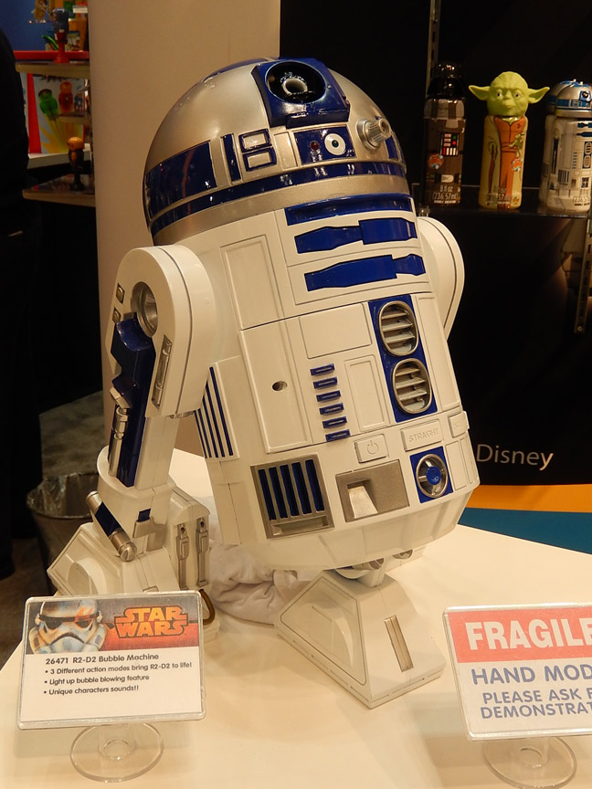I’m just bubbling with excitement with this next vendor, Imperial Toys. They are LucasFilm’s first licensee for bubble solutions, you know, the wands that you blow through the loop on the end and blow bubbles. You might have seen some of their products already hitting stores such as Walmart, various styles of bottles with character heads such as Vader, Yoda and R2-D2. There will also be lightsabers and collectible tins. Their big item was a large R2-D2 bubble dispenser that will retail for around $80. The dispenser is about the size of Hasbro’s Interactive R2-D2 from a few year ago. The bubbles will come out of the eyeport and there are three settings for the dome to move, straight, oscillate and combo. This R2 fan is definitely picking one up! www.imperialtoy.com