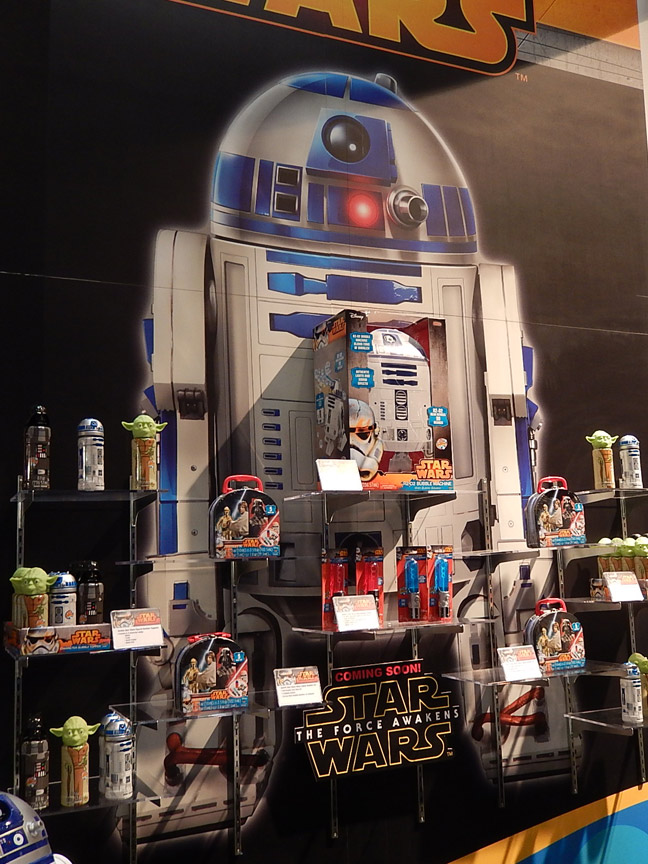 Finally I stopped to talk with the guys at ThinkGeek, the company that brought you the TaunTaun sleeping bag. I heard them say they have 40+ items waiting for approval from Disney. That sounds expensive. They didn’t allow any photos to be taken so I will do my best to describe them. There was a Space Slug snoglobe. They had R2-D2 cupcake pans, essentially R2 bodies you cook cupcakes in where the cupcake dome is R2’s dome. Yumm! Next was an R2-D2 Bento Box for your lunch needs. A cool item was a Death Star waffle maker. Picture round waffles that look like the Death Star. They can’t resist maple syrup of that magnitude! There were also cookie cutters in various character head shapes. The last item was a Star Wars dinner set that they are working on. They were sure of the final configuration yet but what they showed included an R2-D2 napkin, a C-3PO napkin holder, a Death Star plate and lightsaber knife fork and spoon. Their mockup looked like a fun way to eat dinner. www.thinkgeek.com